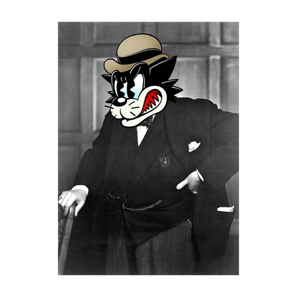 • Entwurf: Ein freches Porträt von Winston Churchill mit einem Katzenkopf, das eine moderne Variante des traditionellen Porträts darstellt.