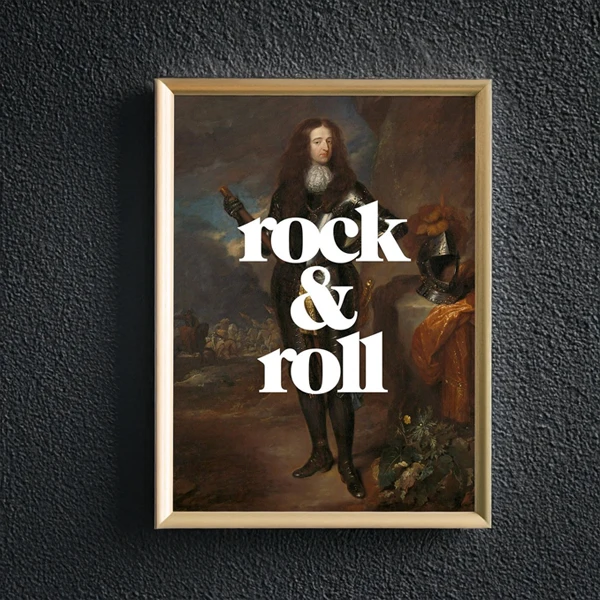 - Design: A fusion of traditional art and modern typography, featuring bold “Rock and Roll” text superimposed on a vintage portrait.