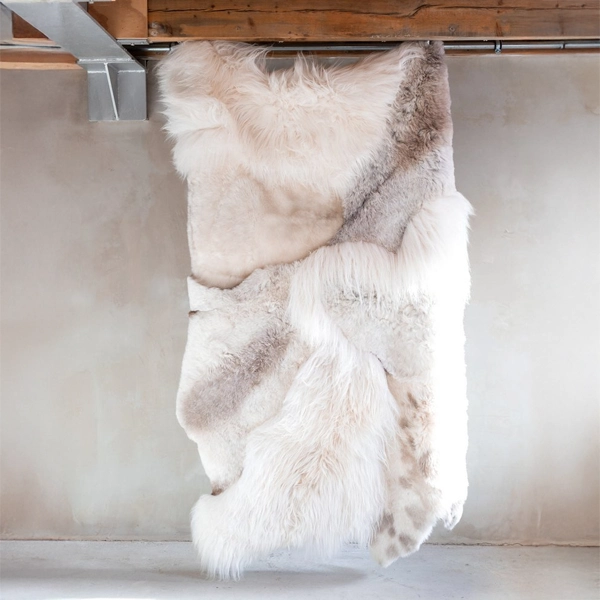 Sheepskin Rug Melange white elevates your space with this bold and masculine statement piece that brings warmth, texture, and rugged sophistication to any room. Crafted from multiple rich neutral and white sheepskins seamlessly stitched together. Each rug is one-of-a-kind, with natural variations in color and texture, making it a truly unique addition to any interior. Or use it to add an element of wild luxury to your man cave, this thick, durable, and naturally insulating rug delivers both style and comfort.